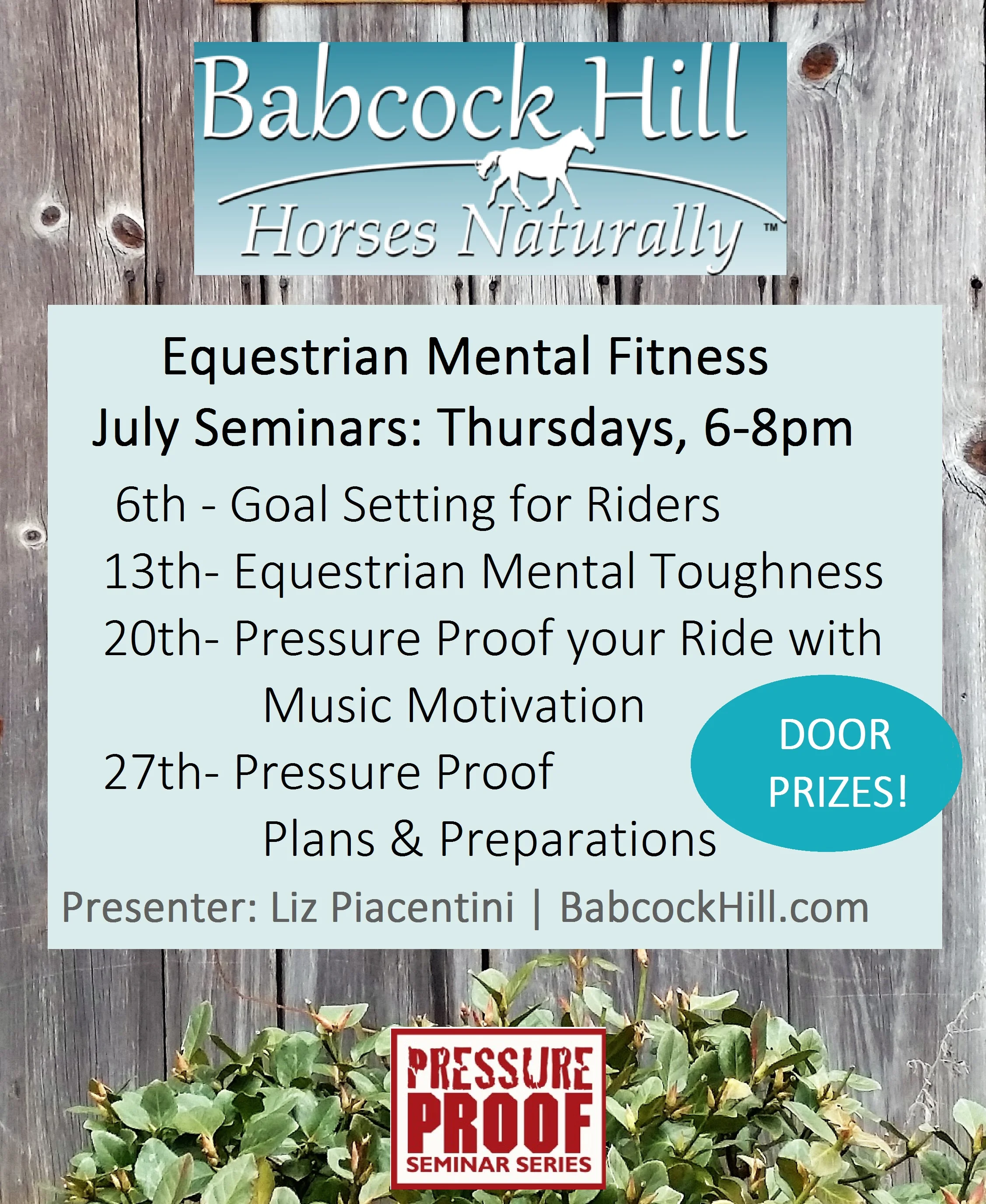It is Equestrian Mental Fitness month in July here at Babcock Hill. Riding is 70% mental! This seminar series an excellent way to reach your riding goals and overcome fears. We would like to welcome Liz Piacentini who will be presenting these fun unmounted seminars every Thursday evening in July from 6pm-8pm. Learn more about Liz and what she does here: http://betweenourears.com/estimates/ We will have snacks and beverages available. All ages, disciplines and levels are welcome. Cost is $25/session or $80 if you signup for all four.